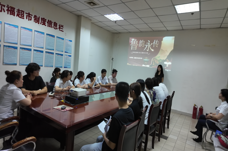 8月,团队成员来到济宁市瑞尔福开启了本次实践的核心部分。首先为调查在商业经营中融入本地鲁文化特色的必要性与可行性,团队成员以鲁文化为依托,结合前期文化体验的实践内容,设计并发布面向超市员工及顾客群体的调查问卷。在调查中,受访者普遍认为商业经营可以与本地优秀传统文化相结合,从而增强品牌知名度,提升自身市场竞争力。这种结合,不仅需要涉及具有地域特色的物质、非物质文化遗产,而且需要还包括鲁文化中蕴含的诚实守信的价值理念。本次问卷调查,为后续团队成员开展文化沙龙宣讲活动提供了真实的民意观点与数据支持。同时,为了解文化特色与商业之间的相互作用,团队成员与商场负责人就该主题展开深入交流。交流中,负责人介绍了瑞尔福始终秉持“立足本地文化、注重消费者体验、强调品质与创新驱动”的发展理念,并特别阐释了“诚信为本、服务至上”的核心经营理念。通过与管理者的交流,团队深刻认识到:地域文化元素融入到商场整体环境与服务细节之中,能够有效增强消费者在消费时的文化归属感以及对品牌的认同感,从而将其转化为经营者持久的商业竞争力。此次交流也为后续活动的开展提供了宝贵的资料支撑。