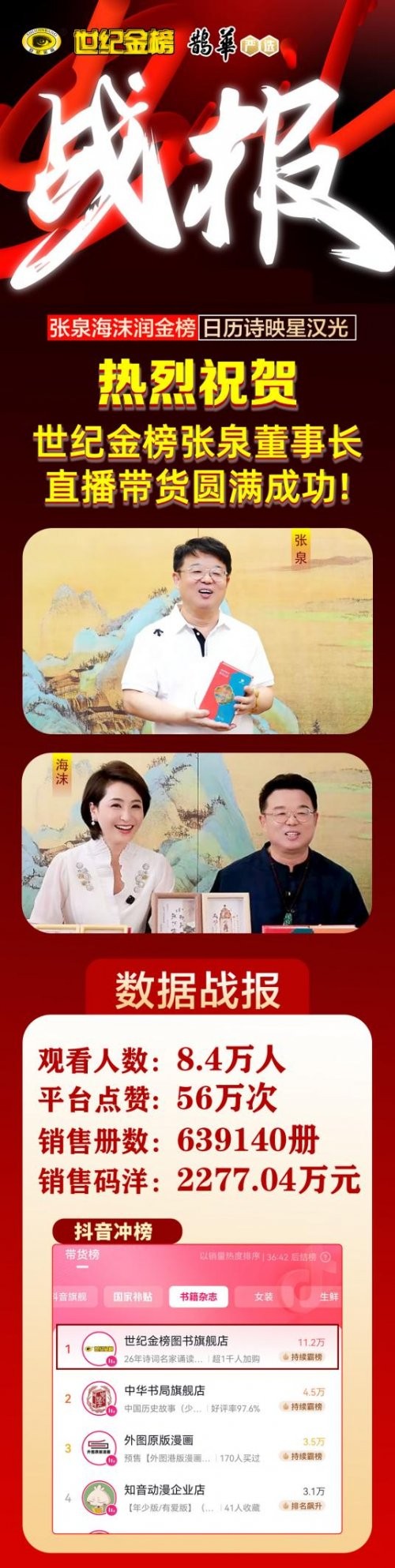 直播中,主持人海沫表示,非常荣幸和张泉董事长一起直播,说起世纪金榜,那可真是家喻户晓、金光闪闪的国民品牌!从济南到全国,有些产品还卖到了国外。世纪金榜的图书好口碑、好质量、好颜值,用济南方言话就是,“杠赛来”!从双色印刷到二维码植入图书,从中国梦连环画出海到AI智能教育系统,世纪金榜一直是行业风向标!作为济南人,咱必须竖起大拇指——世纪金榜是咱泉城递给世界的一张金名片!特别是世纪金榜推出的国学诗词日历,每一页都可以说是一场微型艺术展,不仅仅是一本日历,也是一本有诗有画,有声有色的图书。