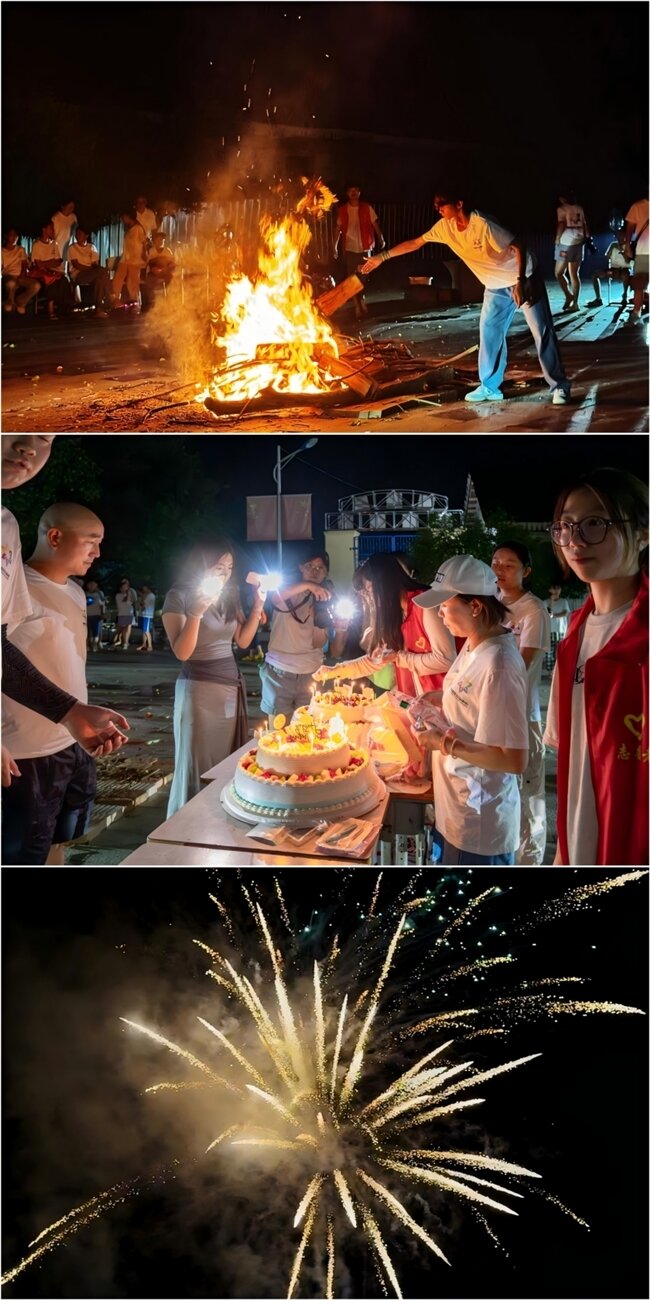 篝火晚会的火焰在夜幕中跳动,成为最温暖的星辰。孩子们自信站上舞台。踩着节拍演唱朴素的情怀,掌声、欢呼声与蝉鸣交织成歌。当蛋糕的甜香漫过操场,当烟花在夜空绽放出璀璨星河,此刻,无私奉献不再是抽象的词汇,而是递出蛋糕时沾着奶油的指尖,是为孩子擦去汗水的纸巾,是照亮归途的每一盏手电微光。
