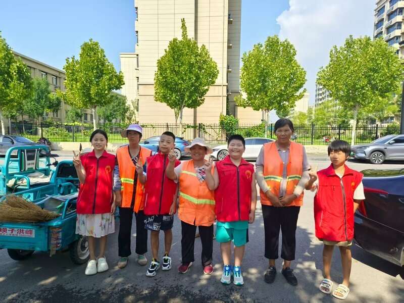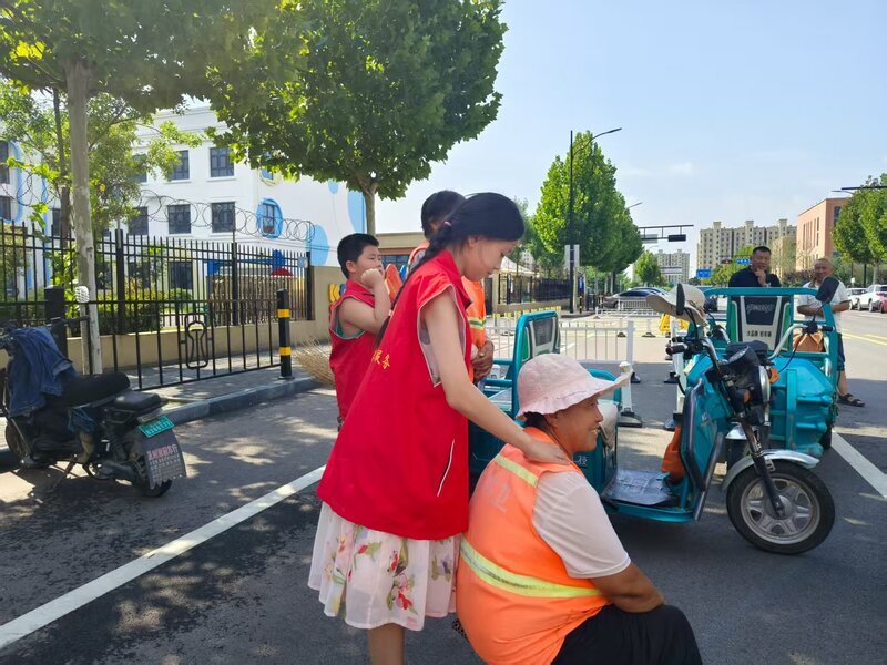 活动中最温馨感人的一幕悄然发生。队员们看到白发苍苍的清洁工奶奶正顶着烈日辛苦工作,汗水浸湿了她的衣裳。同学们没有丝毫犹豫,主动上前。一部分队员接过奶奶手中的工具,帮忙分担清洁工作;另一部分队员则簇拥到奶奶身边,用稚嫩的小手为她捶背按摩,这突如其来的关怀让奶奶既惊喜又感动,脸上露出了慈祥而幸福的笑容,连连夸赞:“真是好孩子,太谢谢你们了!”