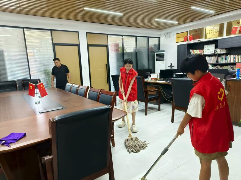 活动的首站,航空小分队来到了风景秀丽的三石村。队员们的第一项任务就是对村委会的办公环境和公共区域进行彻底的清扫。烈日炎炎,但同学们的热情丝毫不减,经过一番努力,村委会的面貌焕然一新,显得更加整洁、有序。