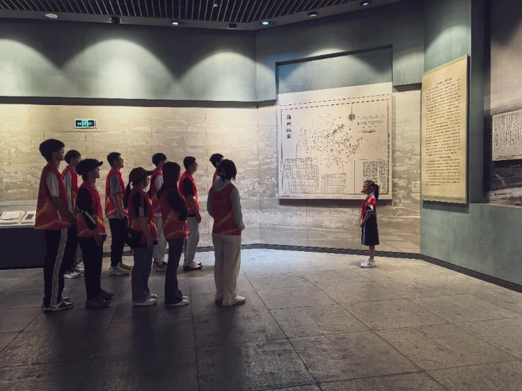 实践团成员身着红色志愿服,与佩戴“小推车志愿者”绶带的小学生讲解员相遇,开启了一场跨越代际的红色对话。小讲解员在“巨型浮雕”前讲述战斗故事,于“活动展板”旁传递信仰火种,围“海州地图”解析红色脉络。实践团成员专注聆听,从革命浮雕的英雄剪影里感受热血冲锋,在早期活动展板前触摸信仰重量,于地图讲解中思索红色脉络,让红色精神扎根心底。