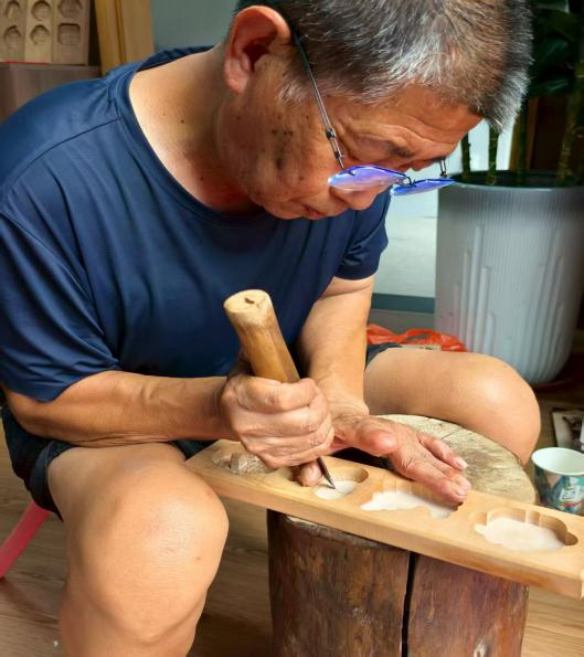 随后,王丕文现场演示了榼子的雕刻技艺。他手持刻刀,在木块上灵活游走,时而精雕细琢,时而大刀阔斧,原本普通的木料很快便显露出清晰的花纹轮廓。“一刀一刻都得有准头,既要保证图案完整,又要让模具好用,得下苦功夫练。”团队成员们被这娴熟的手艺和专注的神情深深打动,更体会到了“慢工出细活”的匠心。