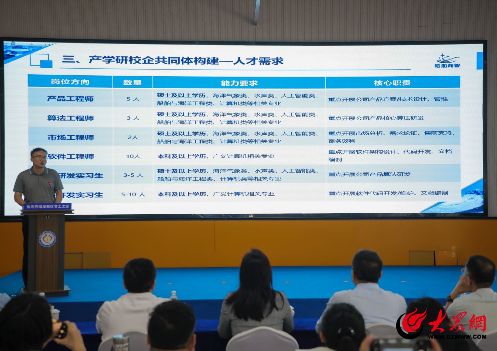 同时,青岛哈船海智科技有限公司、青岛浦芮斯光电科技有限公司发布了校企合作清单与人才需求计划;山东科技大学、青岛黄海学院等高校展示了学科优势、实习实训资源及方案;校企合作标杆企业青岛中加特电气股份有限公司分享了合作经验与成果;新聘任的职业规划导师代表、青岛大东自动化科技有限公司董事长杨巍作了表态发言。