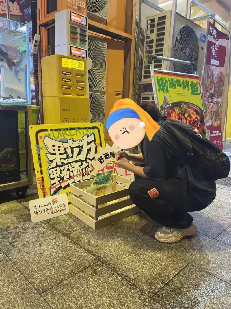 有人对着摊位的小酒瓶研究许久,然后转身去旁边超市买配合调酒的水溶C。