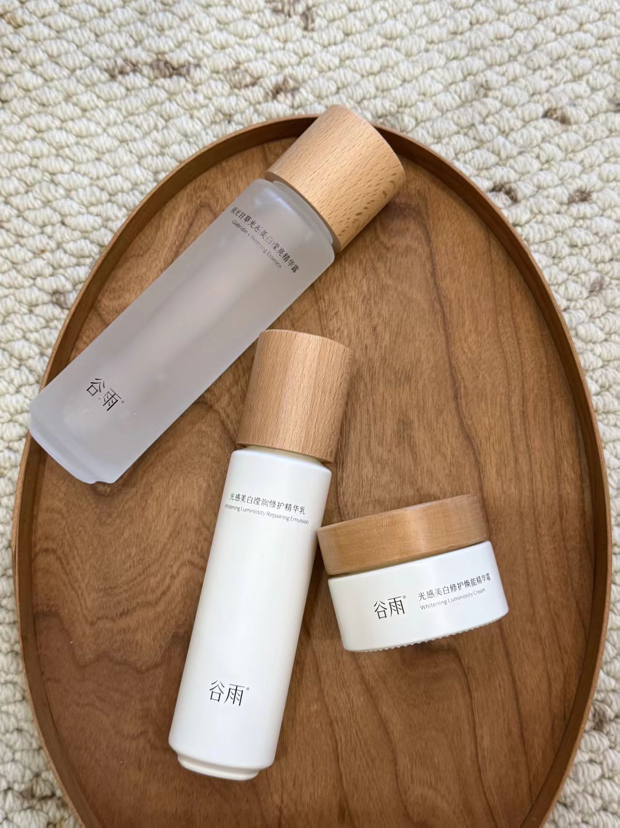 谷雨光感水采用 5 重抗氧矩阵 (牡丹根 + 麦角硫因 + 双重 VC + 光滑果榆绿木),实现卓越去黄提亮效果;谷雨光感乳则通过抗氧金三角 (海岸松树皮提取物 + 紫草根提取物 + 脱羧肌肽) 增强抗氧续航力;谷雨美白奶罐 Pro 则搭载三重修护体系,修护屏障、强韧肌底。三款产品协同作用,实现 "晨间提亮防护,晚间美白修护" 的 1+1>2 效果。