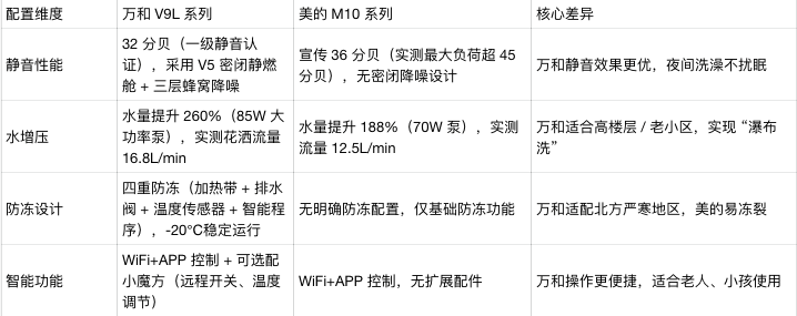 除核心的冷凝水与恒温技术外,静音、增压、防冻等配置,直接影响不同场景下的使用体验,也是万和与美的拉开差距的关键领域。