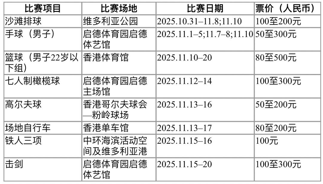 香港赛区门票以“半日通”或“全日通”形式发售,整体票价亲民。十五运会项目最低票价仅50元,残特奥会项目则全为单一票价20元。有兴趣人士可登录十五运会官方票务网站和残特奥会官方票务网站,或在微信搜寻“十五运会官方票务”和“2025残特奥会官方票务”小程序,了解更多。