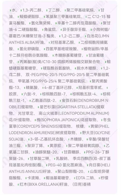 ●适合肤质:全肤质可用,油皮也清爽、干皮深滋润、敏感肌强呵护。配方无酒精、无A类、无酸类等刺激性成分,敏感肌亦可安心、高效抗老。