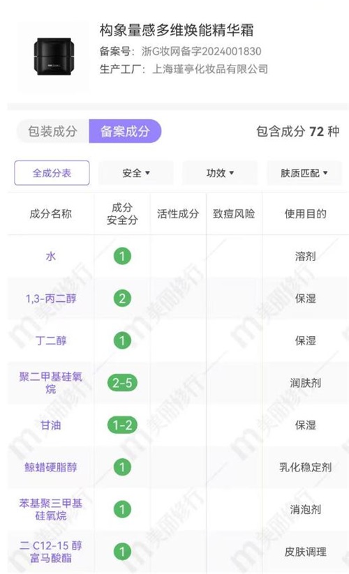 附:关于构象精华水和构象编织霜的备案号及产品检测数据,来源于专业第三方化妆品成分查询和口碑查看网站