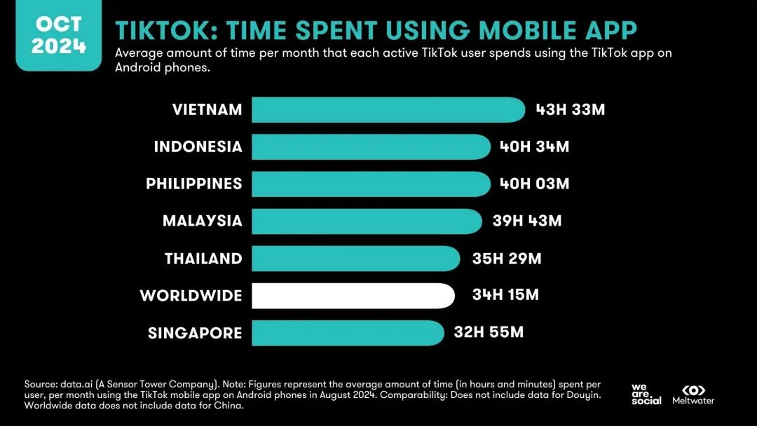 Meltwater和We Are Social联合发布的《2024年全球数字报告》数据显示,东南亚用户月均使用TikTok时长超35小时,远超全球平均水平,构筑了坚实的用户基础。
